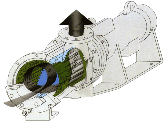 The Gorator works on a simple inclined rotor principle, which gives the machine its self-cleaning, non-clog, trouble-free characteristics under the most difficult conditions, with a rotor at an oblique angle on the end of the pump shaft. Rotation of the impeller produces a centrifugal action which pumps the material and discharges it radially through the outlet. Notched teeth in the rotor plate mesh with teeth in peripheral stator bars to chop the material during its passage through the pump.