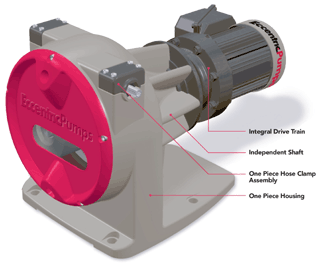 Eccentric Pumps has created a revolution in peristaltic hose pump design. Their unique approach employs a single oversized roller that compresses a highly engineered, low friction hose through more than 360 degrees of rotation. Benefits include more flow per revolution and only one compression and expansion per cycle. At equal performance points the pump runs slower and the hose lasts longer than pumps with multiple shoes or rollers.